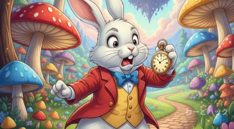 「遅刻しちゃう!」と言いながら慌ただしく走り回る白ウサギ。