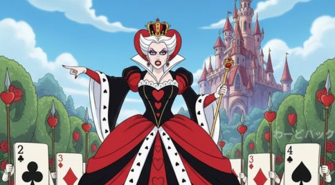 「首をはねよ!」が口癖の独裁的な女王。怒りっぽく、理不尽なルールを振りかざします。