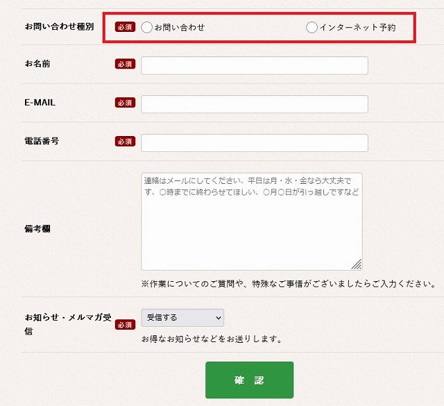 2. 希望内容を入力(所要時間:約3分) します。 最初に、お問い合わせ種別から、「お問い合わせ」または「インターネット予約」をクリックして、選びます。